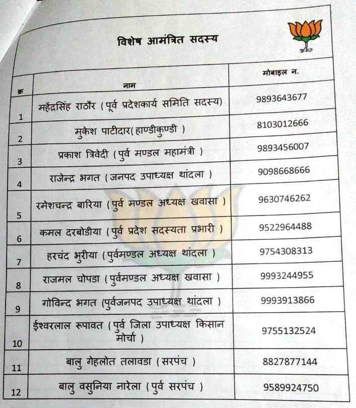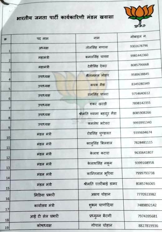 जिले के 19 मण्डलों की कार्यकारणी की घोषणा आज जिला भाजपा कार्यालय से जिले के वरिष्ठ नेताओ की उपस्थिति के साथ की जा रही है उक्त मण्डल कार्यकारिणी की घोषणा में कुछ देर पूर्व खवासा मण्डल की घोषणा की गई है जिसमे, खवासा मंडल अध्यक्ष तोलसिह गणावा की मंडल टीम की घोषणा आज की गई जिनमे कमलसिंह चावड़ा (भामल) और देवीसिंह देवदा (सेमलिया) को मंडल महामंत्री नियुक्ति किया गया, कार्यकरणी में 6 उपाध्यक्ष और 6 मंत्री, 12 विशेष आमंत्रित सदस्य, 42 कार्यकारिणी सदस्य, 19 पदों के साथ कुल 73 सदस्यीय टीम की मंडल कार्यकरणी की घोषणा की गई।