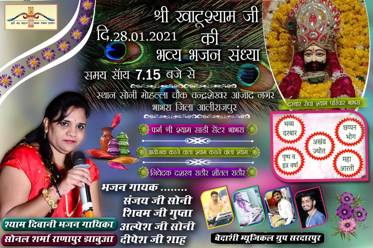 एक शाम बाबा खाटूश्याम के नाम भजन संध्या 28 जनवरी शाम सवा 7 बजे से स्थान सोनी मोहल्ला चौक चन्द्रशेखर आजाद नगर (भाभरा) में आयोजन होगा। आयोजन में भजन की प्रस्तुति गायिका सोनल शर्मा राणापुर, संजय सोनी, शिवम गुप्ता, अल्पेशजी सोनी, दीपेश शाह के साथ वेदाशी म्यूजिकल ग्रुप सरदारपुर के द्वारा स्तुति दी जाएगी। भजन प्रस्तुति के बाद बाबा खाटूश्याम की आरती कर महाप्रसादी का वितरण किया जाएगा।