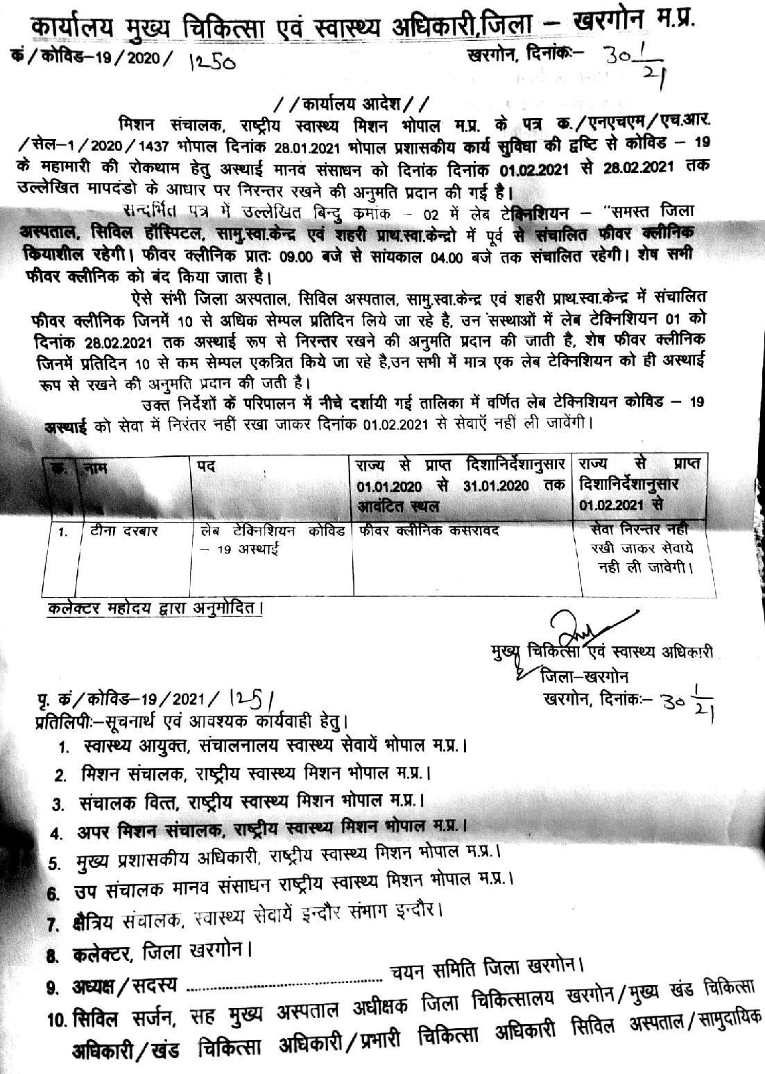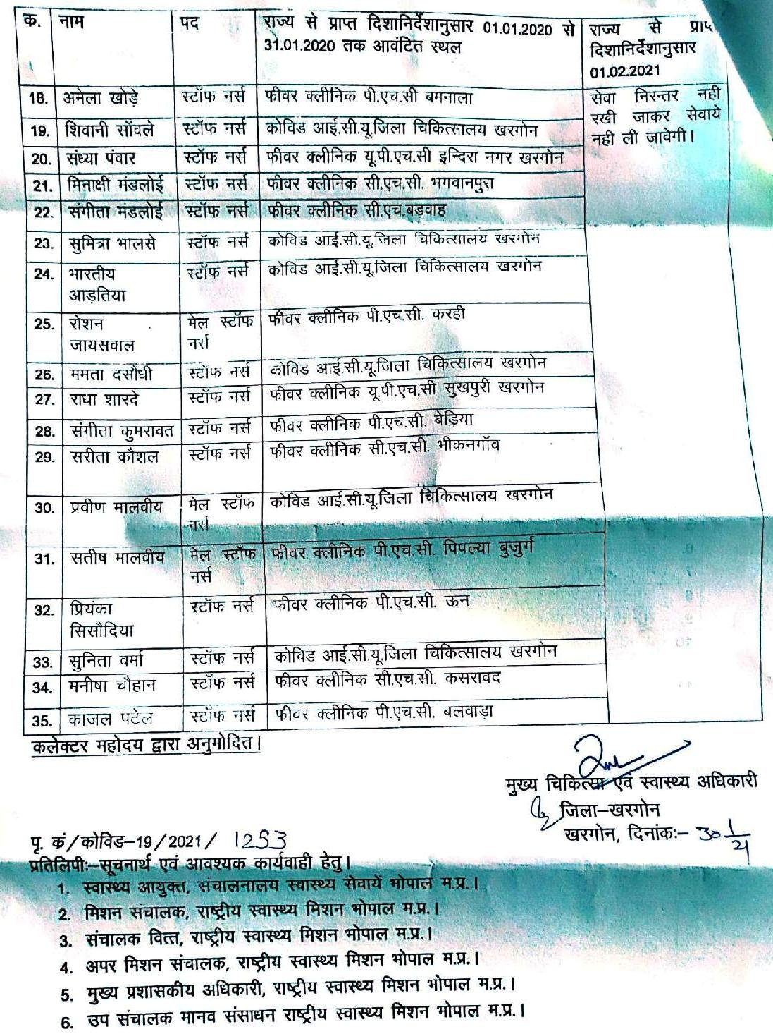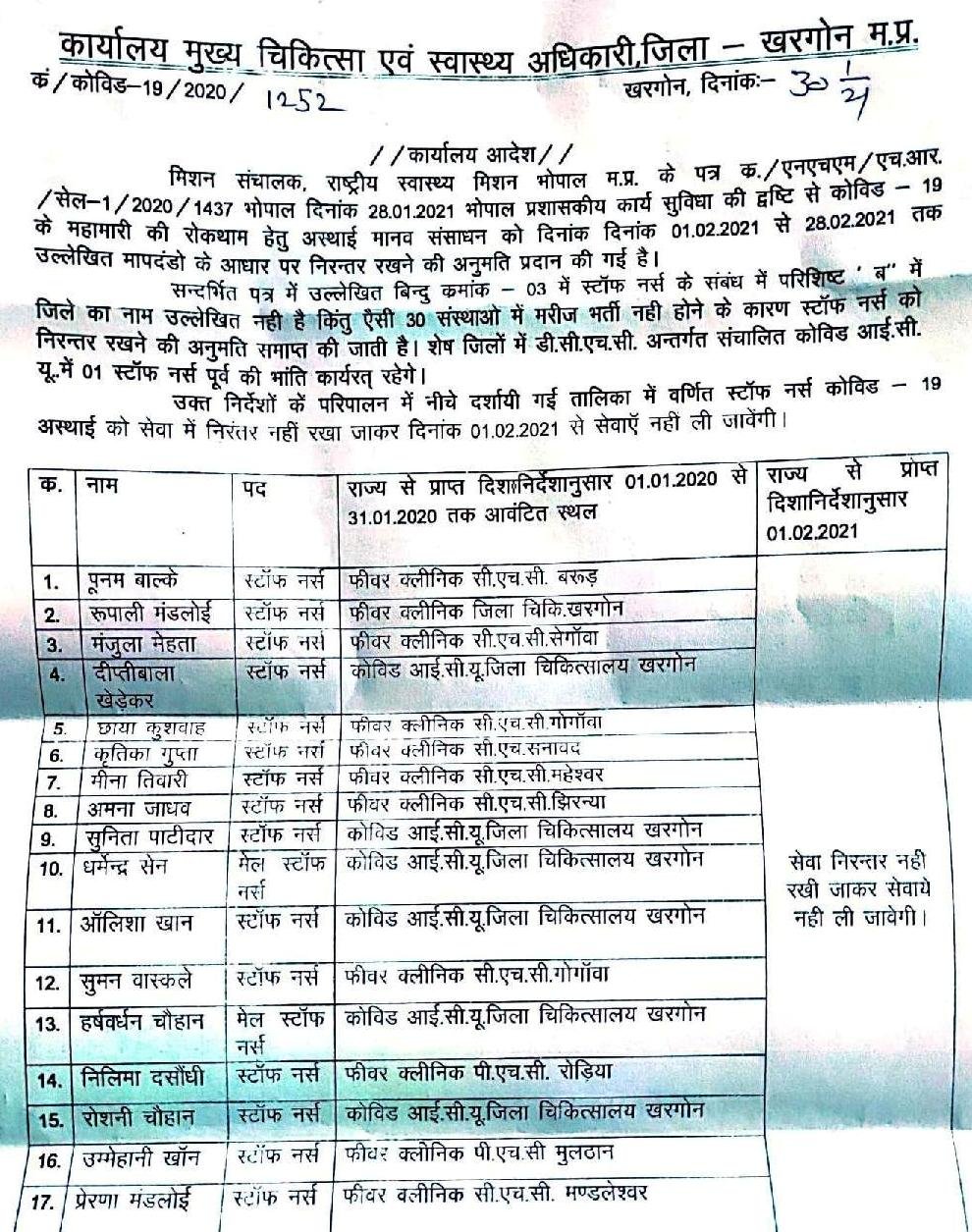जिले में 30जनवरी को सभी कोवीड सेन्टरो से 35 स्टाफ नर्स, 11 कोविड आईसीयू सपोर्ट स्टाफ और एक लेब टेक्नीशियन की सेवाएं समाप्त करने के आदेश कार्यालय मुख्य चिकित्सा एवं स्वास्थ्य अधिकारी जिला खरगोन ने जारी किए है। अभी तो कोरोना वायरस महामारी के लक्षण के मरीजों की संख्या कम हो गई है लेकिन कोरोना वाइरस के टिके लगाने की प्रक्रिया शुरू हो चुकी है वही सरकार टिके लगाने की प्रक्रिया को प्राथमिक स्वास्थ्य केंद्र तक पहुँचाना चाहती है, जिसके लिए स्वास्थ्य विभाग में स्टाफ की कमी के चलते टिके लगाने की प्रक्रिया में देरी होगी जिसके चलते सभी कोवीड 19के कर्मचारियों ने वापस रखने की मांग की जा रही है।