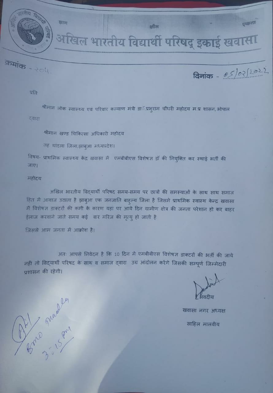 अखिल भारतीय विद्यार्थी परिषद (एबीवीपी) की खवासा इकाई द्वारा स्थाई एमबीबीएस डॉक्टर की मांग को लेकर स्थानीय प्राथमिक स्वास्थ्य केंद्र पर धरना दिया गया। जिसके पश्चात ब्लॉक चिकित्सा अधिकारी को स्वास्थ्य मंत्री डॉ. प्रभुराम चौधरी के नाम एक ज्ञापन सौंपा। ज्ञापन में बताया कि, खवासा प्राथमिक स्वास्थ्य केंद्र पर स्थाई डॉक्टर न होने से आए दिन मरीजों को परेशानिया उठानी पड़ती है और ईलाज के लिए बहार जाना पड़ता है। ज्ञापन के मध्याम से कहा गया कि, यदि 10 दिनों में स्थाई डॉक्टर की न्यूक्ति नहीं की जाती है तो एबीवीपी उग्र आंदोलन करेगी। धरने का नेतृत्व विद्यार्थी परिषद की खवासा इकाई के अध्यक्ष साहिल मालवीय ने किया। धरना व ज्ञापन देने में एबीवीपी जिला संयोजक प्रताप कटारा, जिला जनजाति कार्य प्रमुख सुनील डामोर, कॉलेज इकाई अध्यक्ष विकास भूरिया, पवन पाटीदार, मनीष सेन, अंकित पाटीदार, अंकित कहार आदि कार्यकर्ता उपस्थित थे।