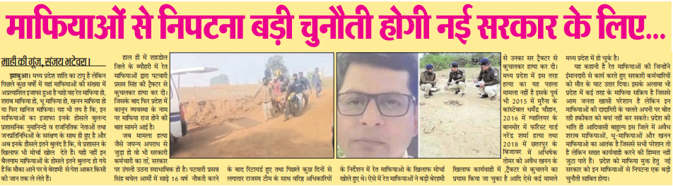 यह कहानी है रेत माफियाओं की जिन्होंने ईमानदारी से कार्य करते हुए सरकारी कर्मचारियों को मौत के घाट उतार दिया। इसके अलावा भी प्रदेश में कई तरह के माफिया सक्रिय है जिससे आम जनता खासी परेशान है लेकिन इन माफियाओं की दादागिरी के चलते अपनी पर बीत रही हकीकत को बयां नहीं कर सकते। प्रदेश की भांति ही आदिवासी बाहुल्य इस जिले में अवैध शराब माफियाओं, भू-माफियाओं और खनन माफियाओ का आतंक है जिससे सभी परेशान तो है लेकिन सख्त कार्यवाही करने की हिम्मत नहीं जुटा पाते हैं। प्रदेश को माफिया मुक्त हेतु नई सरकार को इन माफियाओं से निपटना एक बड़ी चुनौती साबित होगा।