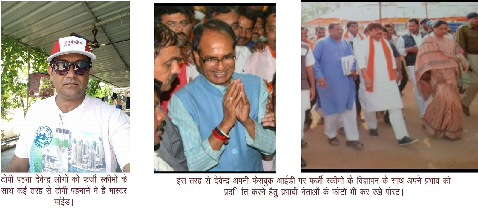 हमारे सूत्र बताते हैं कि, देवेंद्र भानपुरिया सिर्फ और सिर्फ अपने शातिराना दिमाग से लीज पर ली गई जमीन पर एग्रीमेंट के विरुद्ध कई ऐसे कार्य किए हैं जो अपराध की श्रेणी में आता है। वहीं लोगों को फर्जी स्कीमों के नाम पर ठगी करने वाला देवेंद्र अपने प्रभाव को प्रदर्शित करने के लिए अपने सोशल मीडिया अकाउंट पर स्थानीय एवं तात्कालिक मंडल अध्यक्ष वाले पोस्टर के साथ तात्कालिक मुख्यमंत्री शिवराज सिंह चौहान, तात्कालिक विधायक कलसिंह भाभर, कैलाश विजयवर्गीय आदि प्रभावशील नेताओं के फोटो फर्जी उपहार योजना स्कीमो के कैटलॉग की छायाप्रति की तरह पोस्ट किए हुए हैं । ताकि प्रशासनिक अमला देवेंद्र भानपुरिया के प्रभाव को सोशल मीडिया पर पोस्ट किए हुए प्रभावी नेताओं के फोटो को देख अधिकारी वर्ग देवेंद्र के प्रभाव को समझ सके और किसी भी तरह की बड़ी कार्रवाई से बच सके का उद्देश्य शातिर देवेंद्र का होना बताया जा रहा है।