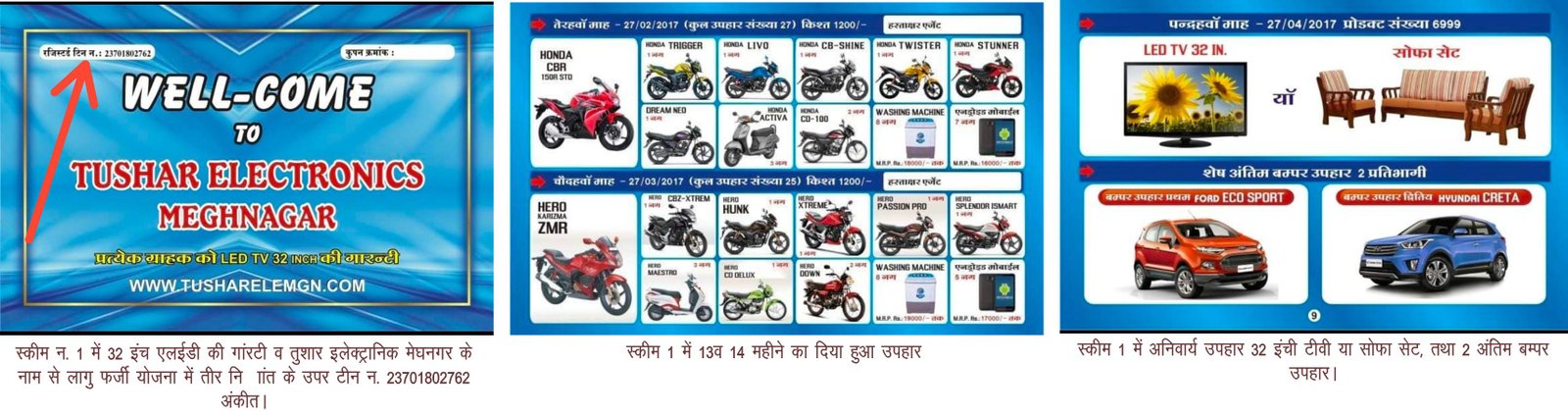 उक्त स्कीम तुषार इलेक्ट्रॉनिक मेघनगर जिस पर वेबसाइट भी दर्शायी गई है एवं उक्त फर्म का टीन नंबर 23701802762 दर्शाया हुआ है। उक्त स्कीम में पेज नंबर 11 पर दूसरे हिस्से में दर्शाया गया है कि मैं ग्राहक तुषार इलेक्ट्रॉनिक्स मेघनगर वाला की टीवी, सोफा सेट की बुकिंग योजना में हिस्सा ले रहा हूं , इस योजना में 14 माह तक प्रतिमाह 12 सौ रुपये जमा करना है। वही पेज नंबर 12 पर 14 बिंदुओं में नियम शर्ते लिखी गई जो संचालक के पक्ष में ही पूरी तरह दर्शाता है।