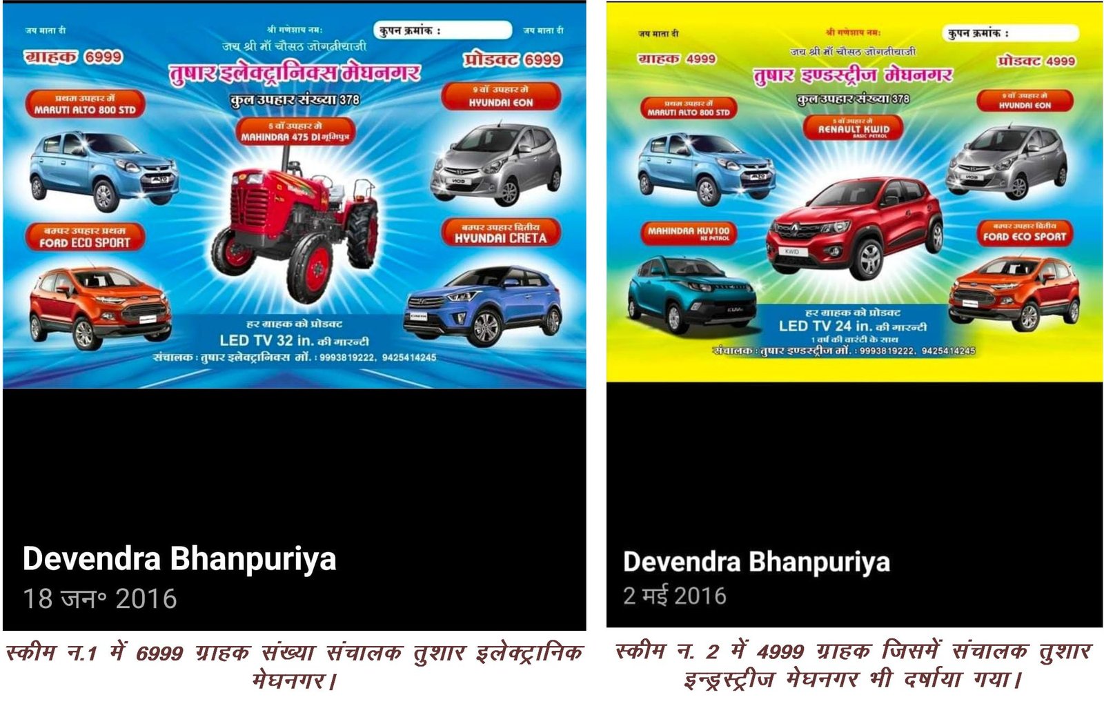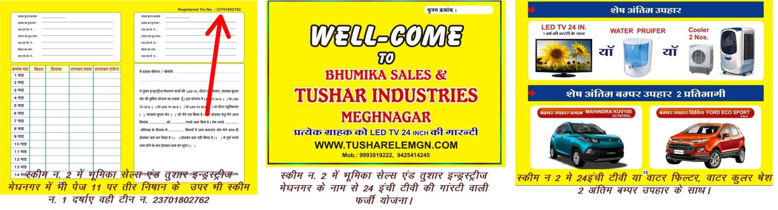वहीं इसी तरह की दूसरी स्कीम भूमिका सेल्स एंड तुषार इंडस्ट्रीज मेघनगर के नाम से 6 माह बाद 15 अगस्त 2016 से शुरू कर विशेष दो बंपर इनाम के साथ इस योजना में भी 378 उपहार रखे गए थे। जो स्कीम प्रतिमाह 8 सौ रुपये 14 माह में 11200 रुपये वसूल किया जाना उल्लेख किया है। उक्त दुसरी फर्जी स्कीम में 4हजार 9सौ 99 ग्राहक बनाए गए। जिसमें 378 ग्राहक को छोड़ 4621 सदस्य को 24 इंची एलइडी टीवी, वाटर प्यूरीफायर या वाटर कूलर अनुमानित कीमत 6 हज़ार के करीब का माना जा रहा है जो 11 हज़ार 2 सौ प्राप्त कर 6 हज़ार के करीब की सामग्री देकर मोटा मुनाफा कमाया होगा।