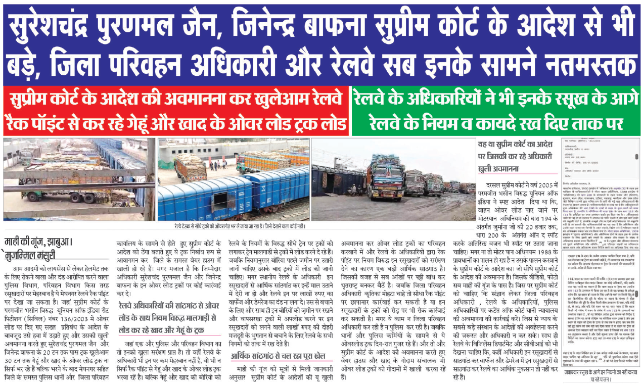 आम आदमी को लायसेंस से लेकर हेलमेट तक के लिए रोकने वाला और दंड आरोपित करने वाला पुलिस विभाग, परिवहन विभाग किस तरह रसूखदारों पर मेहरबान है ये मेघनगर रेलवे रैक पॉइंट पर देखा जा सकता है। जहां सुप्रीम कोर्ट के परमजीत भसीन विरुद्ध यूनियन ऑफ इंडिया रीट पिटीशन (सिविल) नंबर 136/2003 में ओवर लोड पर दिए गए सख्त प्रतिबंध के आदेश के बावजूद उसे हवा में उड़ाते हुए और उसकी खुली अवमानना करते हुए सुरेशचंद्र पुरणमल जैन और जिनेन्द्र बाफना के 20 टन तक पास ट्रक खुलेआम 30 टन तक गेहूं और खाद के ओवर लोड ट्रक ना सिर्फ भर रहे हैं बल्कि भरने के बाद मेघनगर सहित जिले के समस्त पुलिस थानों और जिला परिवहन कार्यालय के सामने से होते हुए सुप्रीम कोर्ट के आदेश को ठेंगा बताते हुए ये ट्रक निर्बाध रूप से आवागमन कर जिले के समस्त वेयर हाउस में खाली हो रहे हैं। मगर मजाल है कि जिम्मेदार अधिकारी सुरेशचंद्र पुरणमल जैन और जिनेन्द्र बाफना के इन ओवर लोड ट्रकों पर कोई कार्रवाई कर दे।