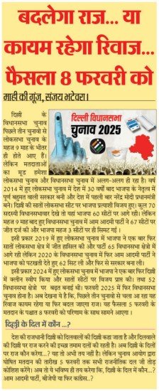इसी प्रकार 2024 में हुए लोकसभा चुनाव में भाजपा ने एक बार फिर दिल्ली में क्लीन स्वीप किया और सातों सीटों पर विजय प्राप्त की। तथा 52 विधानसभा क्षेत्रो पर बढ़त बनाई थी। फरवरी 2025 में फिर विधानसभा चुनाव होना है। अब देखना ये है कि, पिछले तीन चुनावो से चला आ रहा यह रिवाज कायम रहेगा या फिर बदल जाएगा राज। यह फैसला 5 फरवरी के मतदान के पश्चात 8 फरवरी को परिणाम के साथ सामने आएगा ।
