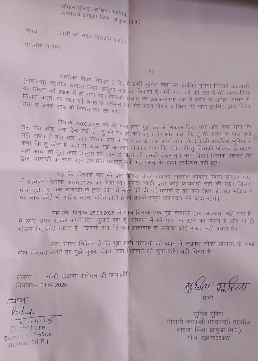 वही दादा एवं परिवार ने पिता के रिश्ते से काका व मां के रिश्ते से मामा हुरसिंग पिता फूलजी भूरिया व परिवार पर भी दबाव बनाया कि, तुम इन लड़कों को तुम्हारे पास रखोगे तो कल से कुछ अच्छा-बुरा हुआ तो तुम्हारी जवाबदारी रहेगी, कहकर धमका दिया। जिसके बाद मामा परिवार ने भी घर से निकाल दिया, यह सुनील ने बताया।