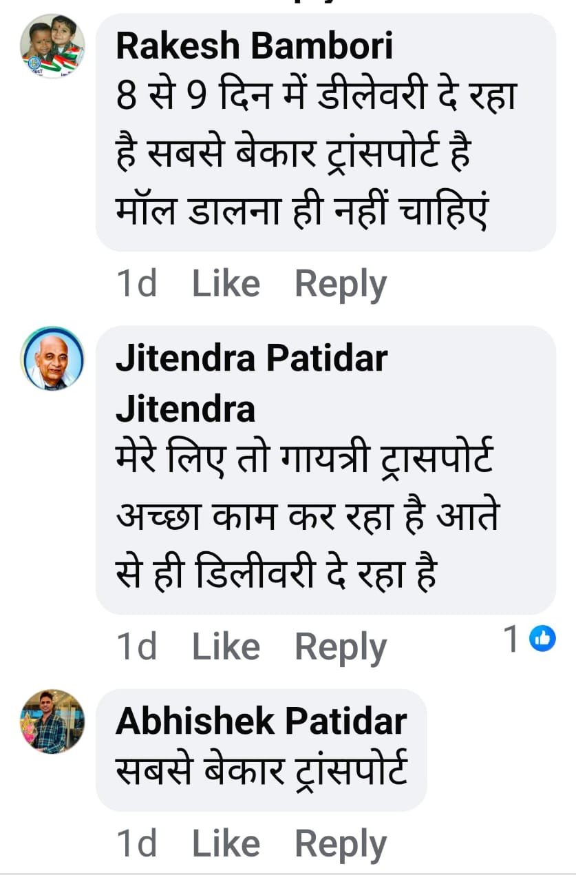 वही राकेश बंबोरी ने लिखा 8 से 9 दिन में डिलेवरी दे रहा है सबसे बेकार यह ट्रांसपोर्ट है, इस ट्रांसपोर्ट पर माल डालना ही नहीं चाहिए।