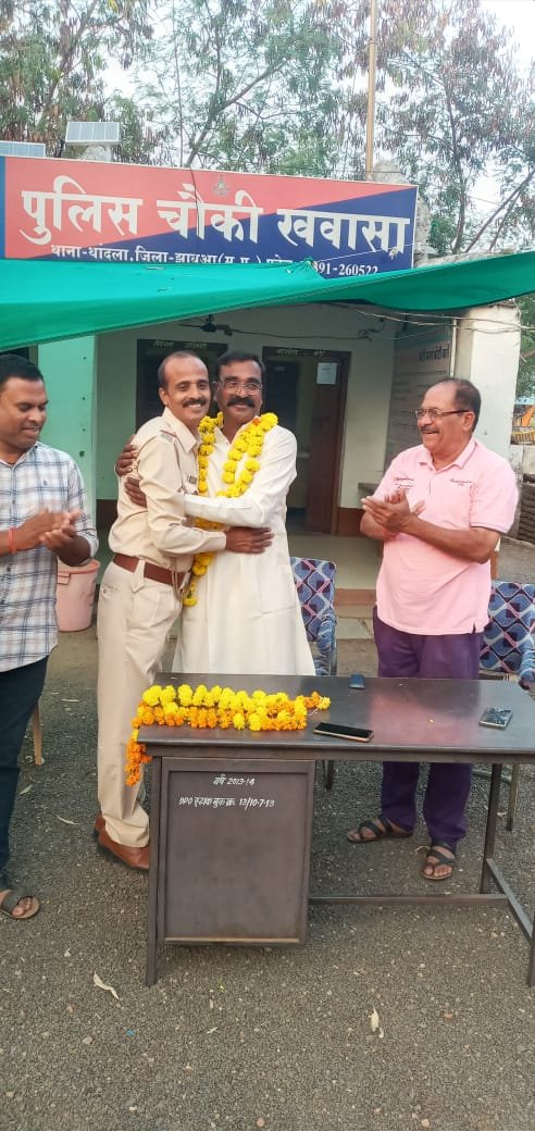 एएसआई बहादुर सिंह पंवार के 40 साल पुलिस विभाग में सेवा के पश्चात शनिवार को खवासा चौकी स्टाफ द्वारा आयोजन कर भावपूर्ण सेवानिवृत्ति विदाई दी। चौकी प्रभारी सुशील पाठक, एएसआई महावीर वर्मा, आरक्षक विजेंद्र यादव, पुखराज गुर्जर, भुरसिंग बारिया, पवन जमरा ने उनके दीर्घायु होने की मंगल कामनाओं के साथ भविष्य की शुभकामनाएं दी। श्री पंवार ने 40 वर्षो तक पुलिस विभाग में अपनी सेवाए खंडवा, अलीराजपुर व झाबुआ आदि जिलो में दी। सेवानिवृति से पहले श्री पंवार करीब 3 वर्षो से पुलिस चौकी खवासा के एएसआई के पद पर कार्यरत थे।